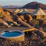 The camp’s 12 tented rooms (4 Superior View, 3 View and 5 Standard), are fit for a queen with plush beds, luxurious en suite bathrooms with an exhilarating roofless section, and a private balcony with superb views of the Abu Huab River valley and Damaraland all around. If you’re upping the ante and staying in the Luxury Room, Mini Suite or Mountain Suite, enjoy that view from your very own splash pool.